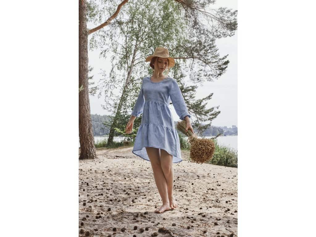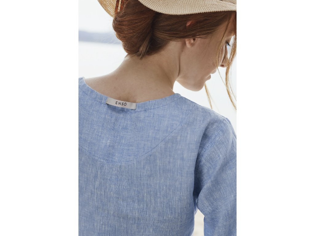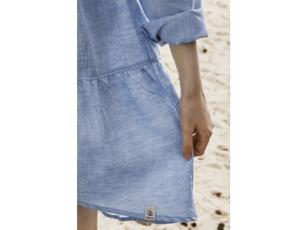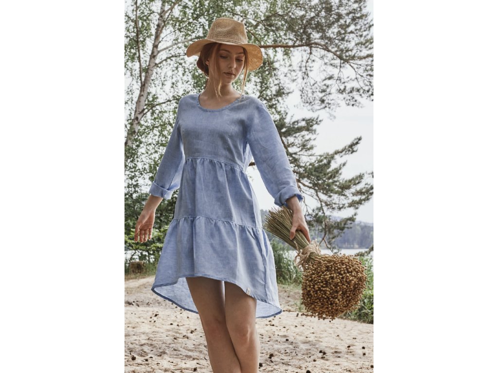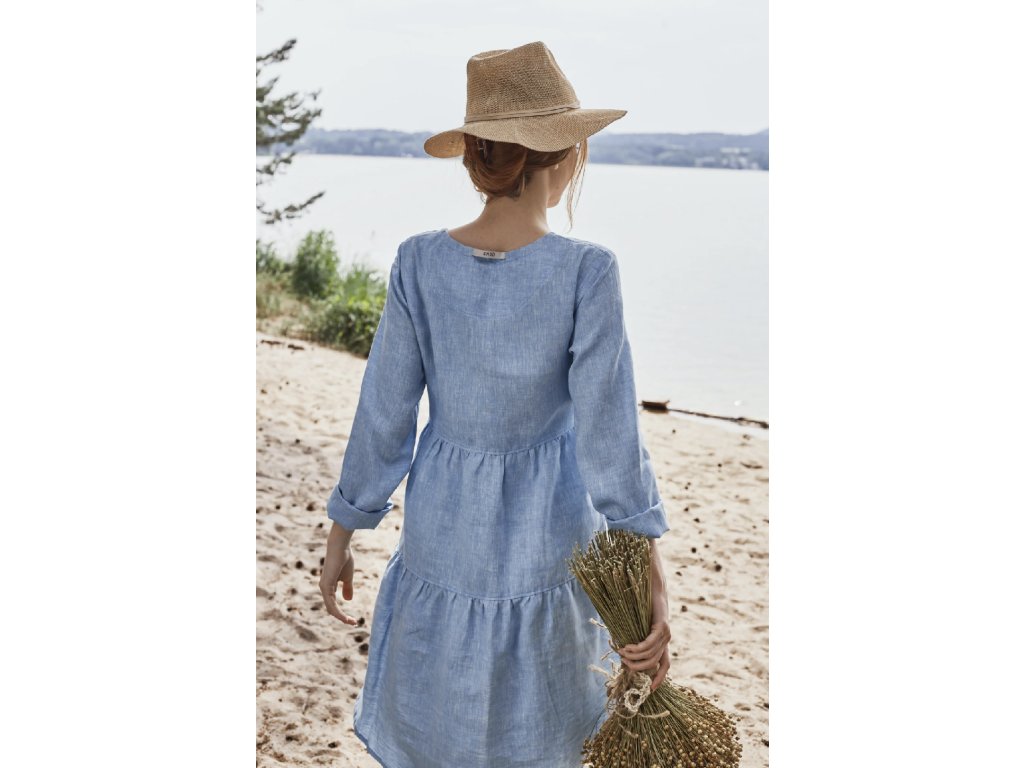 Our seamstresses create dresses from 100% shirting linen, which is softer and can keep you cool and warm. The dress has long sleeves with no cuff, a round neckline, is cut above the waist and is decorated with two cannons. On the inside of the sleeves and under the yoke we have hidden our whimsical lining with an illustration of flax seeds.