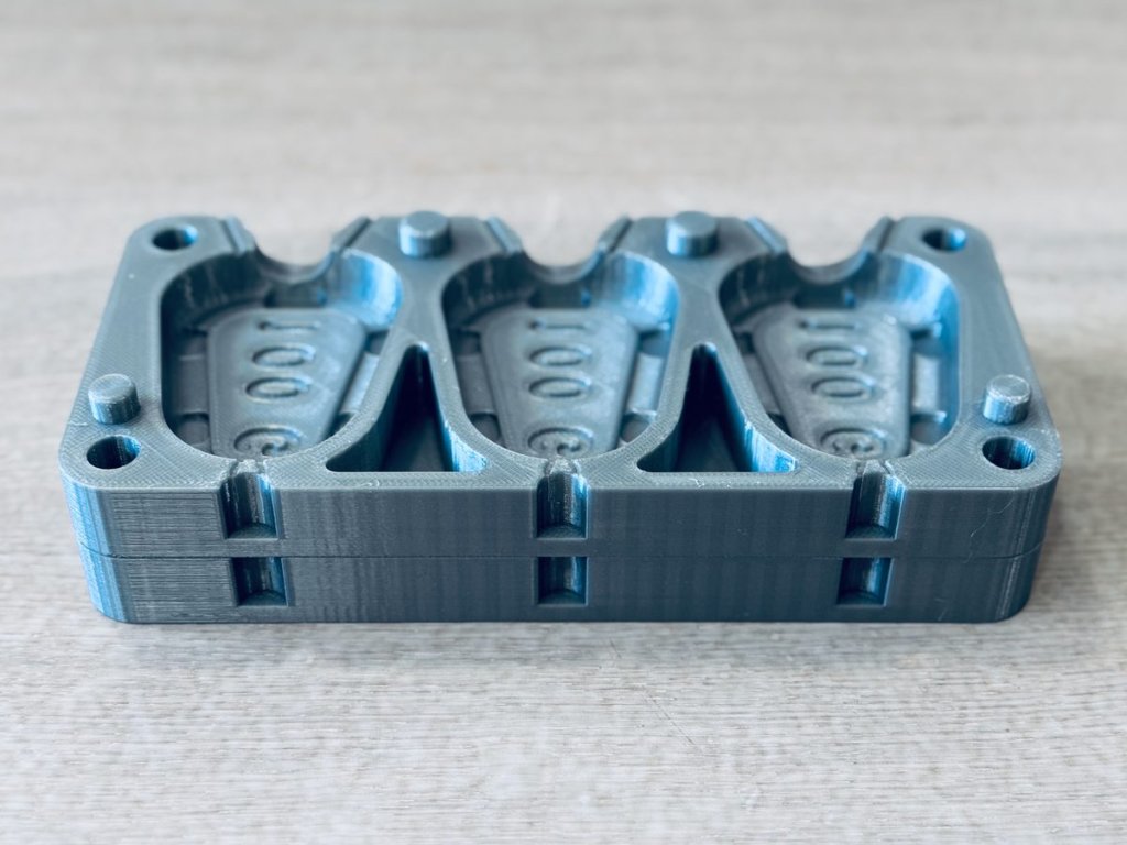 Uvedená hmotnost 100g je vztažená k betonové směsi s objemovou hmotností 2300 kg/m³. Finální hmotnost se může mírně lišit podle konkrétní receptury, množství vody, zhutnění směsi a způsobu vytvrzení. Pokud ladíte vlastní směs nebo jiný typ plniva, doporučujeme si výslednou hmotnost ověřit testovacím odlitkem.