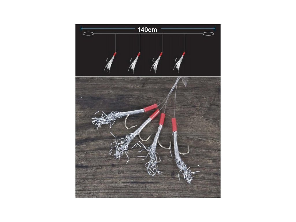 Systém pro lov makrel se čtyřmi háčky. Na háčku je červený převlek a stříbrná třpytivá folie. Součástí balení je EVA Board - pěnová deska na návazce.