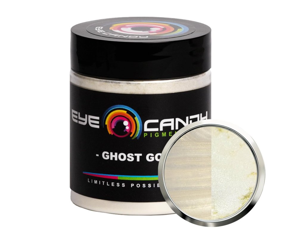 Ghost Gold od Eye Candy Pigments je zlatý interferenční pigment na bílé bázi – v plastisolu dělá jemný „ghost“ třpyt, který se mění podle světla a povrchu. Největší efekt ukáže na tmavých základech (černá, cola, motor oil), kde se z něj stává výrazný zlatý glow.