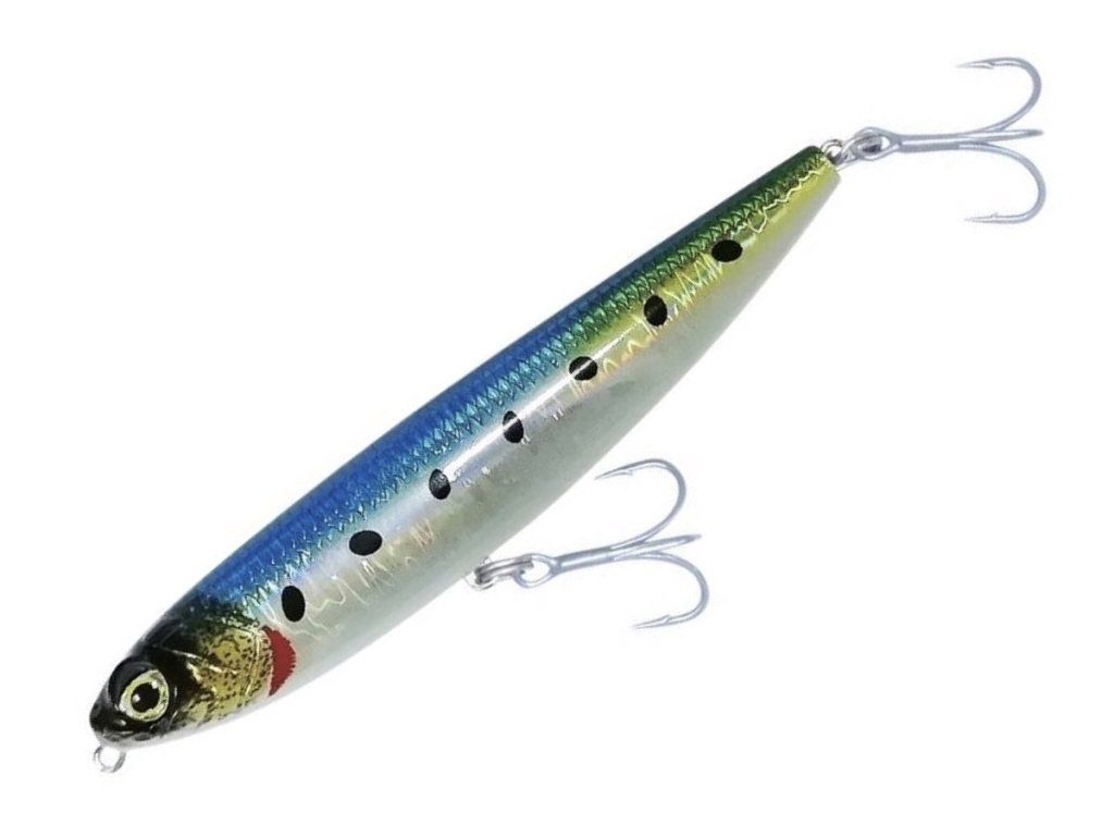 Barva Sardine stojí na logice výraznějšího přírodního mořského baitfish vzoru. Podle vizuálu pracuje s modrým až modrofialovým hřbetem, stříbrnými boky, světlým břichem, lehkým zeleno-zlatým přechodem v horní části těla a výraznými tmavými body po boku. Díky tomu nepůsobí tak neutrálně jako klasické stříbrné varianty, ale pořád zůstává pevně v realistické rybičkové rovině. Právě v tom je její síla. Tahle barva dává velký smysl ve chvíli, kdy chceš rybě nabídnout přirozenou kořist s trochu silnějším vizuálním signálem než u úplně jemných nebo čistě stříbrných vzorů.